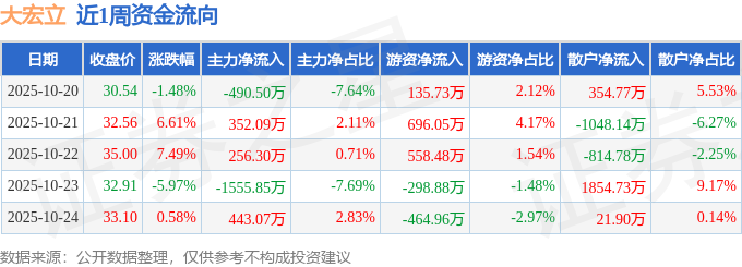 资金流向数据方面,本周大宏立主力资金合计净流出994.9万元,游资资金合计净流入626.42万元,散户资金合计净流入368.48万元。本周资金流向一览见下表: