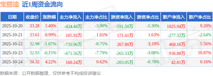 资金流向数据方面,本周宝丽迪主力资金合计净流出1575.81万元,游资资金合计净流出620.66万元,散户资金合计净流入2196.47万元。本周资金流向一览见下表: