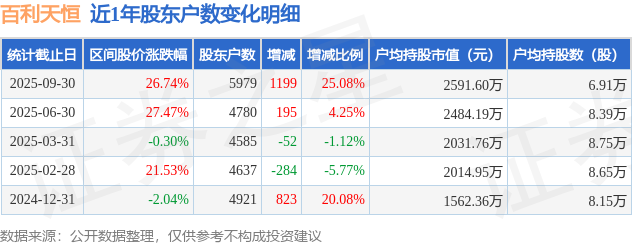 证券之星消息,近日百利天恒披露,截至2025年9月30日公司股东户数为5979.0户,较6月30日增加1199.0户,增幅为25.08%。户均持股数量由上期的8.39万股减少至6.91万股,户均持股市值为2591.6万元。