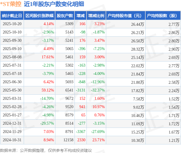 从股价来看,2025年10月10日至2025年10月20日,*ST荣控区间涨幅为4.14%,在此期间股东户数增加166.0户,增幅为3.23%。