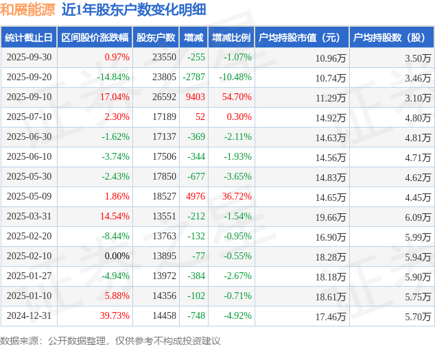 从股价来看,2025年9月20日至2025年9月30日,和展能源区间涨幅为0.97%,在此期间股东户数减少255.0户,减幅为1.07%。