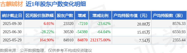 从股价来看,2025年6月30日至2025年9月30日,古麒绒材区间涨幅为6.01%,在此期间股东户数减少7210.0户,减幅为23.62%。