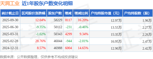 从股价来看,2025年6月30日至2025年9月30日,天润工业区间涨幅为12.04%,在此期间股东户数增加8117.0户,增幅为16.2%。