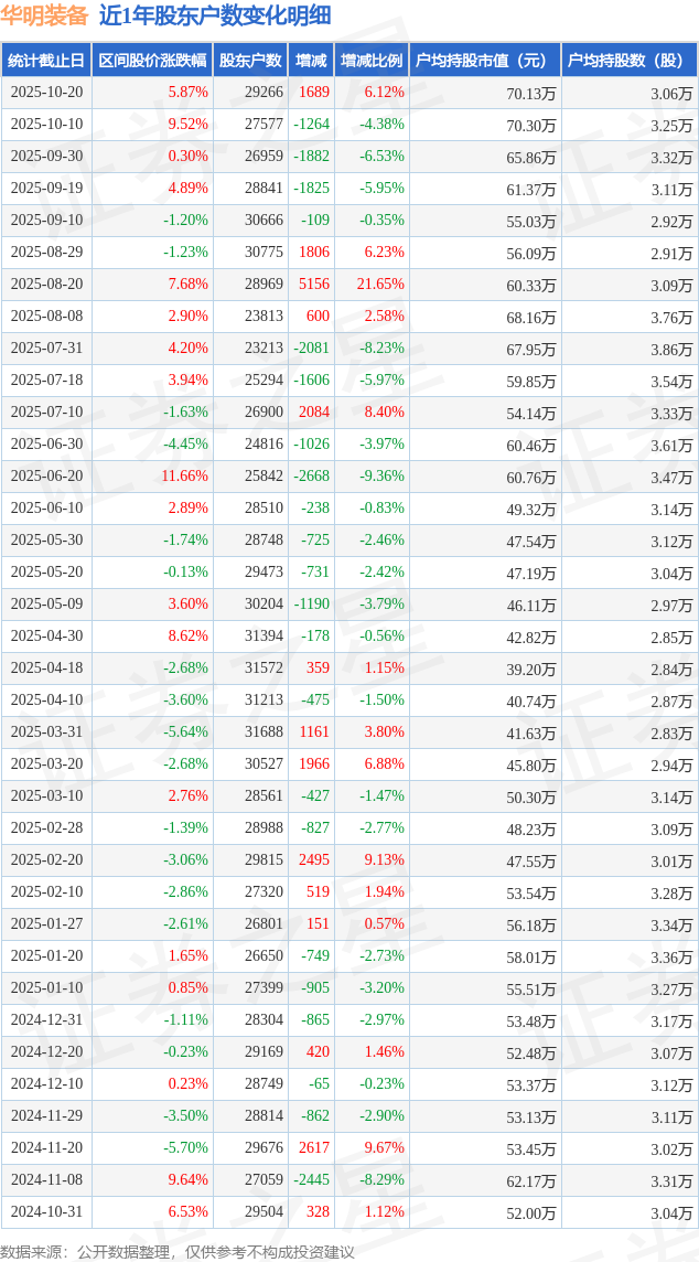 从股价来看,2025年10月10日至2025年10月20日,华明装备区间涨幅为5.87%,在此期间股东户数增加1689.0户,增幅为6.12%。
