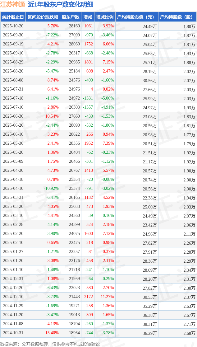 从股价来看,2025年9月30日至2025年10月20日,江苏神通区间涨幅为5.76%,在此期间股东户数增加1061.0户,增幅为3.92%。