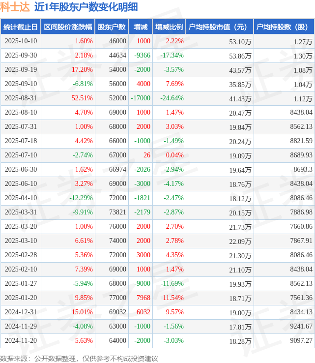 从股价来看,2025年9月30日至2025年10月10日,科士达区间涨幅为1.6%,在此期间股东户数增加1000.0户,增幅为2.22%。