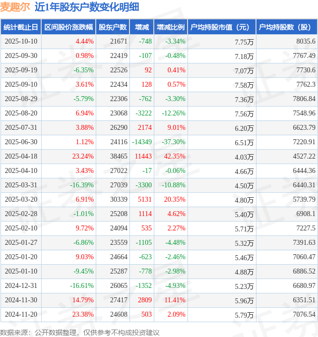 从股价来看,2025年9月30日至2025年10月10日,麦趣尔区间涨幅为4.44%,在此期间股东户数减少748.0户,减幅为3.34%。