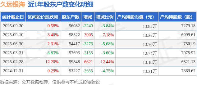 从股价来看,2025年9月10日至2025年9月30日,久远银海区间涨幅为0.58%,在此期间股东户数减少2240.0户,减幅为3.84%。