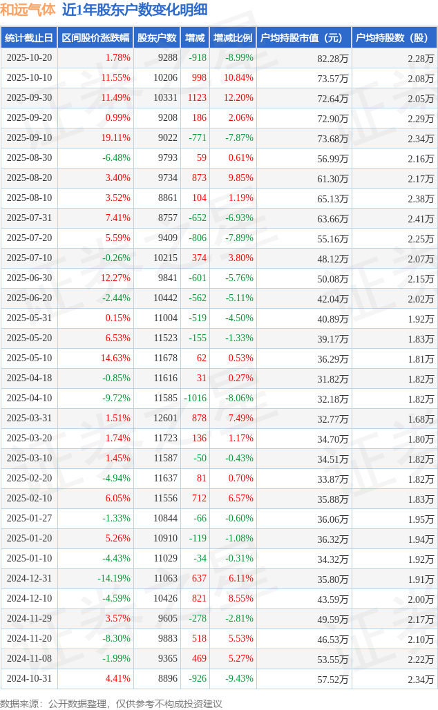 从股价来看,2025年10月10日至2025年10月20日,和远气体区间涨幅为1.78%,在此期间股东户数减少918.0户,减幅为8.99%。