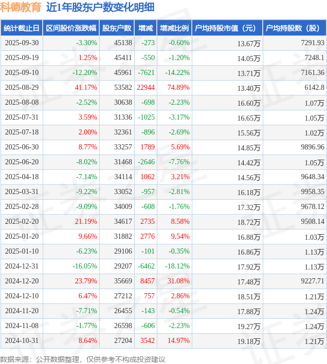 从股价来看,2025年9月19日至2025年9月30日,科德教育区间跌幅为3.3%,在此期间股东户数减少273.0户,减幅为0.6%。