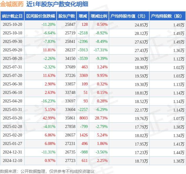 从股价来看,2025年10月10日至2025年10月20日,金城医药区间跌幅为11.2%,在此期间股东户数增加128.0户,增幅为0.5%。