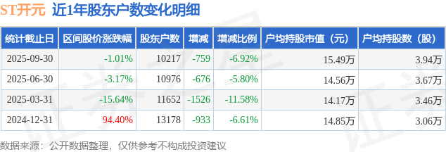 从股价来看,2025年6月30日至2025年9月30日,ST开元区间跌幅为1.01%,在此期间股东户数减少759.0户,减幅为6.92%。