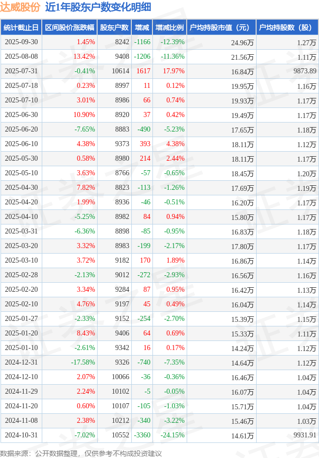 从股价来看,2025年8月8日至2025年9月30日,达威股份区间涨幅为1.45%,在此期间股东户数减少1166.0户,减幅为12.39%。