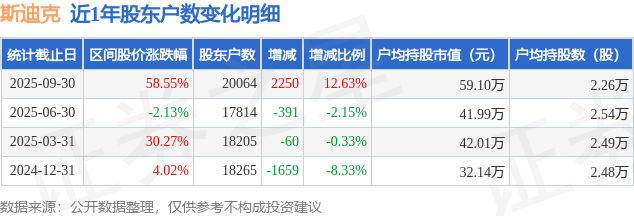 证券之星消息,近日斯迪克披露,截至2025年9月30日公司股东户数为2.01万户,较6月30日增加2250.0户,增幅为12.63%。户均持股数量由上期的2.54万股减少至2.26万股,户均持股市值为59.1万元。