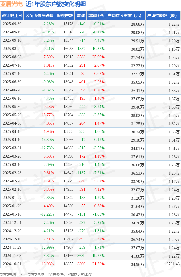 从股价来看,2025年9月19日至2025年9月30日,蓝盾光电区间跌幅为2.28%,在此期间股东户数减少140.0户,减幅为0.91%。