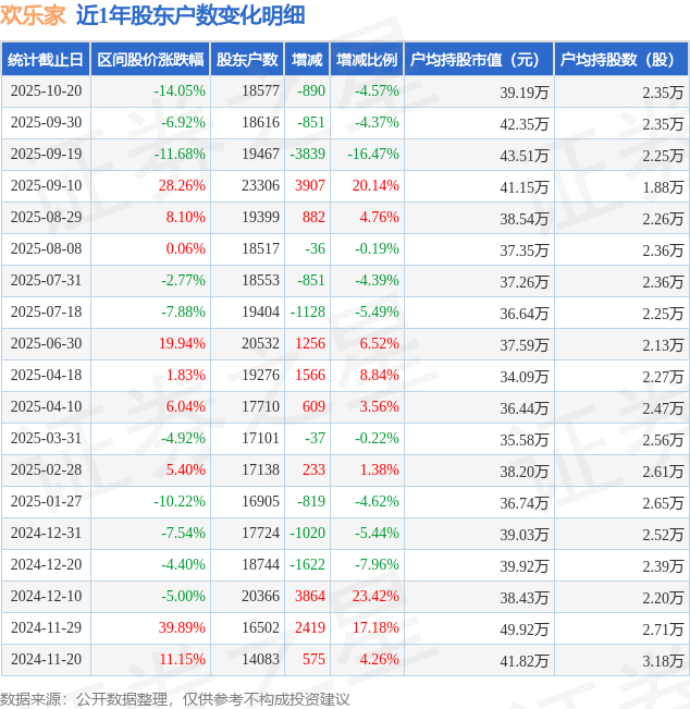 从股价来看,2025年9月19日至2025年10月20日,欢乐家区间跌幅为14.05%,在此期间股东户数减少890.0户,减幅为4.57%。