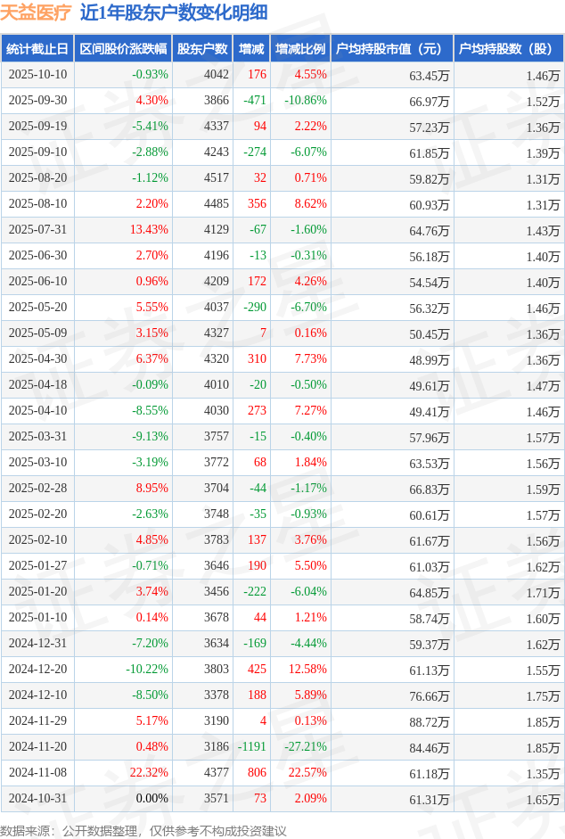 从股价来看,2025年9月30日至2025年10月10日,天益医疗区间跌幅为0.93%,在此期间股东户数增加176.0户,增幅为4.55%。