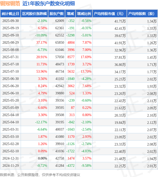从股价来看,2025年9月19日至2025年9月30日,铜冠铜箔区间跌幅为2.1%,在此期间股东户数减少352.0户,减幅为0.56%。