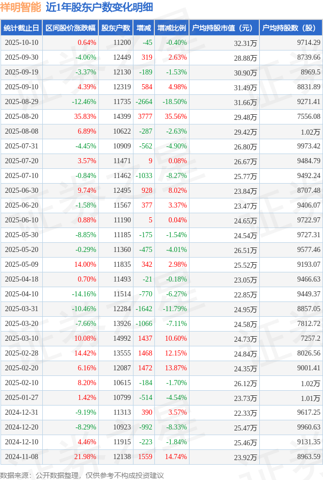 从股价来看,2025年9月30日至2025年10月10日,祥明智能区间涨幅为0.64%,在此期间股东户数减少45.0户,减幅为0.4%。