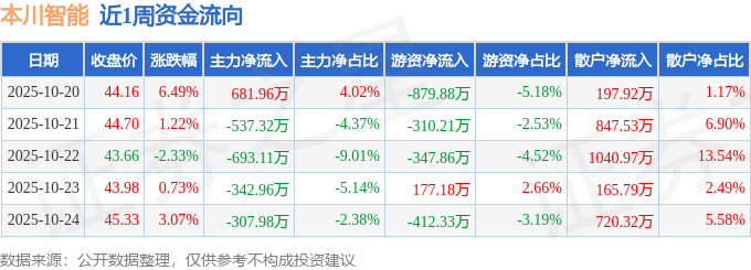 资金流向数据方面,本周本川智能主力资金合计净流出1199.42万元,游资资金合计净流出1773.11万元,散户资金合计净流入2972.53万元。本周资金流向一览见下表: