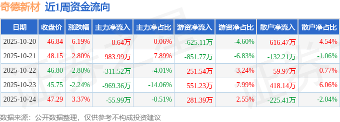 资金流向数据方面,本周奇德新材主力资金合计净流出344.24万元,游资资金合计净流出392.72万元,散户资金合计净流入736.96万元。本周资金流向一览见下表: