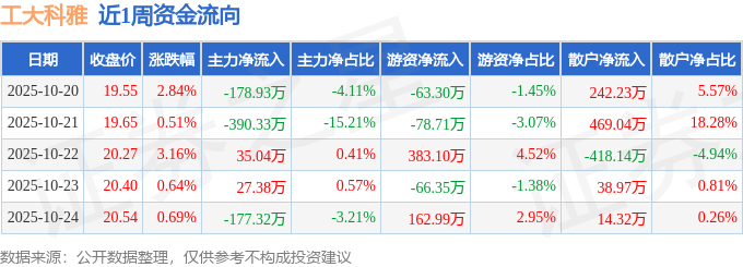 资金流向数据方面,本周工大科雅主力资金合计净流出684.15万元,游资资金合计净流入337.73万元,散户资金合计净流入346.42万元。本周资金流向一览见下表: