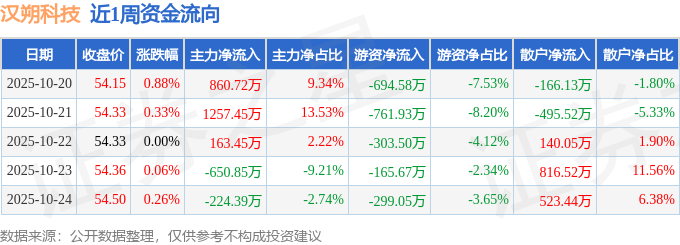 资金流向数据方面,本周汉朔科技主力资金合计净流入1406.37万元,游资资金合计净流出2224.73万元,散户资金合计净流入818.35万元。本周资金流向一览见下表: