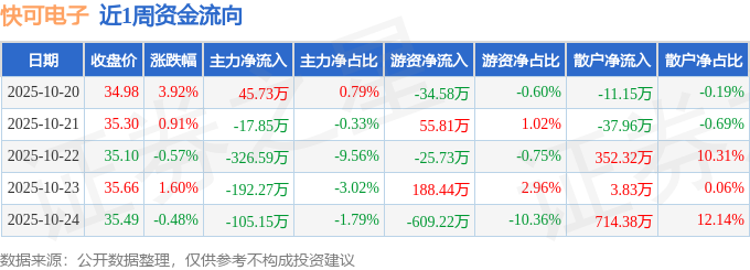 资金流向数据方面,本周快可电子主力资金合计净流出596.13万元,游资资金合计净流出425.29万元,散户资金合计净流入1021.42万元。本周资金流向一览见下表: