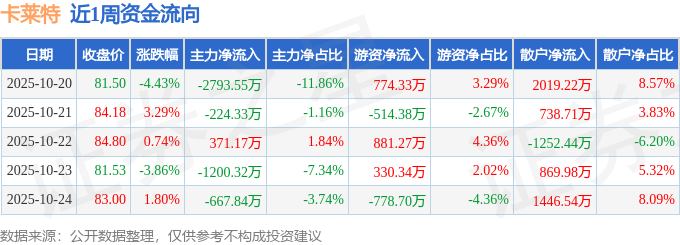 资金流向数据方面,本周卡莱特主力资金合计净流出4514.87万元,游资资金合计净流入692.87万元,散户资金合计净流入3822.01万元。本周资金流向一览见下表: