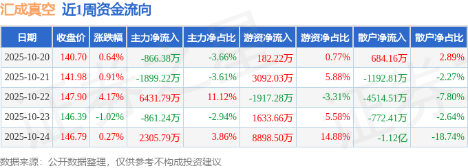 资金流向数据方面,本周汇成真空主力资金合计净流入5110.73万元,游资资金合计净流入1.19亿元,散户资金合计净流出1.7亿元。本周资金流向一览见下表: