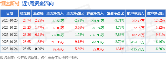 资金流向数据方面,本周恒达新材主力资金合计净流入285.3万元,游资资金合计净流出483.79万元,散户资金合计净流入198.49万元。本周资金流向一览见下表: