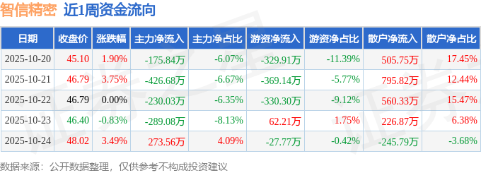 资金流向数据方面,本周智信精密主力资金合计净流出848.07万元,游资资金合计净流出994.91万元,散户资金合计净流入1842.97万元。本周资金流向一览见下表: