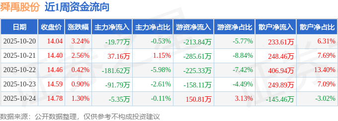 资金流向数据方面,本周舜禹股份主力资金合计净流出261.37万元,游资资金合计净流出732.08万元,散户资金合计净流入993.45万元。本周资金流向一览见下表: