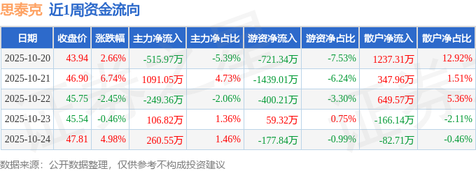 资金流向数据方面,本周思泰克主力资金合计净流入693.09万元,游资资金合计净流出2679.08万元,散户资金合计净流入1985.99万元。本周资金流向一览见下表:
