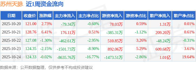 资金流向数据方面,本周苏州天脉主力资金合计净流出1.05亿元,游资资金合计净流出377.88万元,散户资金合计净流入1.09亿元。本周资金流向一览见下表: