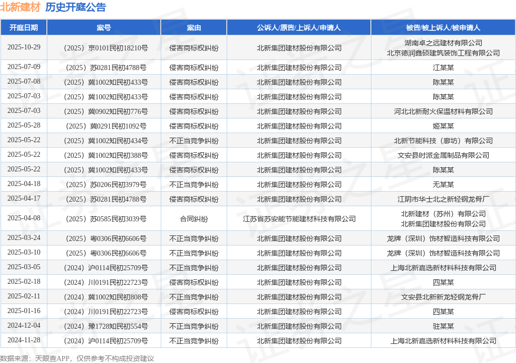 案号:(2025)京0101民初18210号根据统计,近一年内以北新集团建材股份有限公司为当事人的历史开庭公告有20则,其中案由为“侵害商标权纠纷”的公告以11则居首,其次为“不正当竞争纠纷”有8则,“合同纠纷”有1则。历史开庭公告如下: