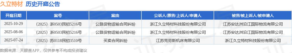 证券之星消息,根据天眼查APP显示,近日公布了一则浙江久立特材科技股份有限公司作为原告/上诉人的开庭公告,详细内容如下: