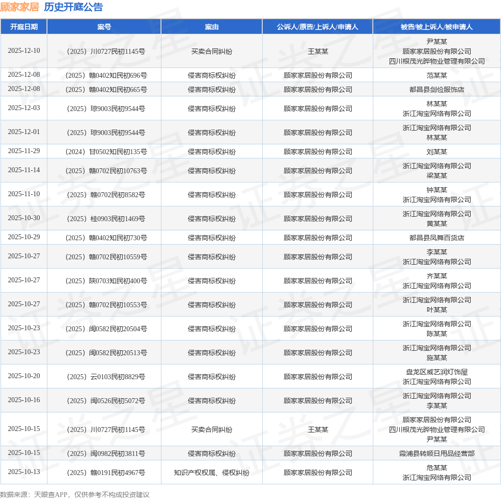 案号:(2025)赣0402知民初730号根据统计,近一年内以顾家家居股份有限公司为当事人的历史开庭公告有194则,其中案由为“侵害商标权纠纷”的公告以157则居首,其次为“买卖合同纠纷”有8则,“商标权权属、侵权纠纷”有7则。历史开庭公告(前20条)如下: