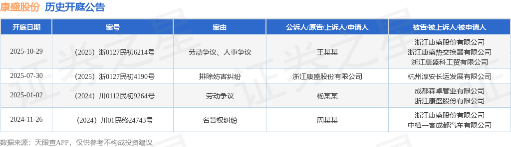 根据统计,近一年内以浙江康盛股份有限公司为当事人的历史开庭公告有4则,其中案由为“劳动争议”的公告以1则居首,其次为“劳动争议、人事争议”有1则,“名誉权纠纷”有1则。历史开庭公告如下: