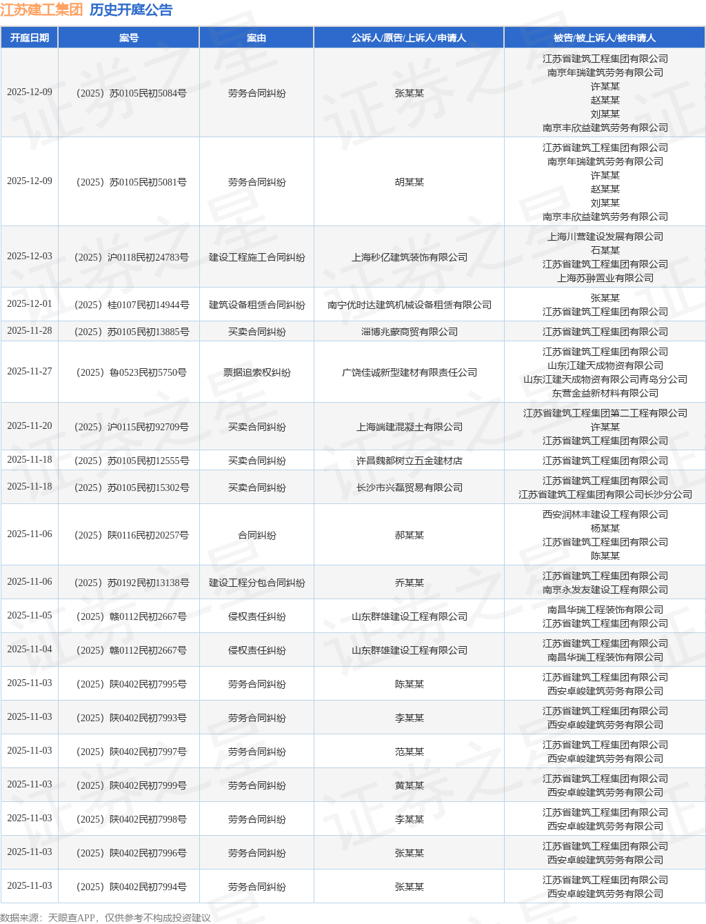 案号:(2025)苏0191民初6597号根据统计,近一年内以江苏省建筑工程集团有限公司为当事人的历史开庭公告有1005则,其中案由为“买卖合同纠纷”的公告以223则居首,其次为“建设工程施工合同纠纷”有159则,“建设工程分包合同纠纷”有126则。历史开庭公告(前20条)如下: