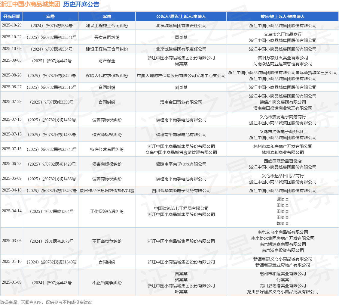 案号:(2024)浙07民初534号根据统计,近一年内以浙江中国小商品城集团股份有限公司为当事人的历史开庭公告有17则,其中案由为“侵害商标权纠纷”的公告以4则居首,其次为“合同纠纷”有3则,“不正当竞争纠纷”有2则。历史开庭公告如下: