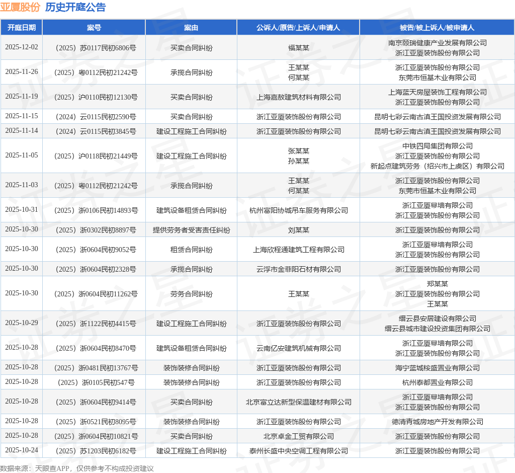 案号:(2025)浙1122民初4415号根据统计,近一年内以浙江亚厦装饰股份有限公司为当事人的历史开庭公告有567则,其中案由为“买卖合同纠纷”的公告以188则居首,其次为“劳务合同纠纷”有107则,“建设工程施工合同纠纷”有65则。历史开庭公告(前20条)如下: