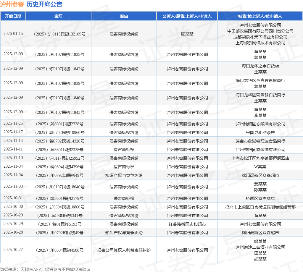 案号:(2025)冀06知民初341号根据统计,近一年内以泸州老窖股份有限公司为当事人的历史开庭公告有362则,其中案由为“侵害商标权纠纷”的公告以275则居首,其次为“侵害商标权”有41则,“商标权权属、侵权纠纷”有10则。历史开庭公告(前20条)如下: