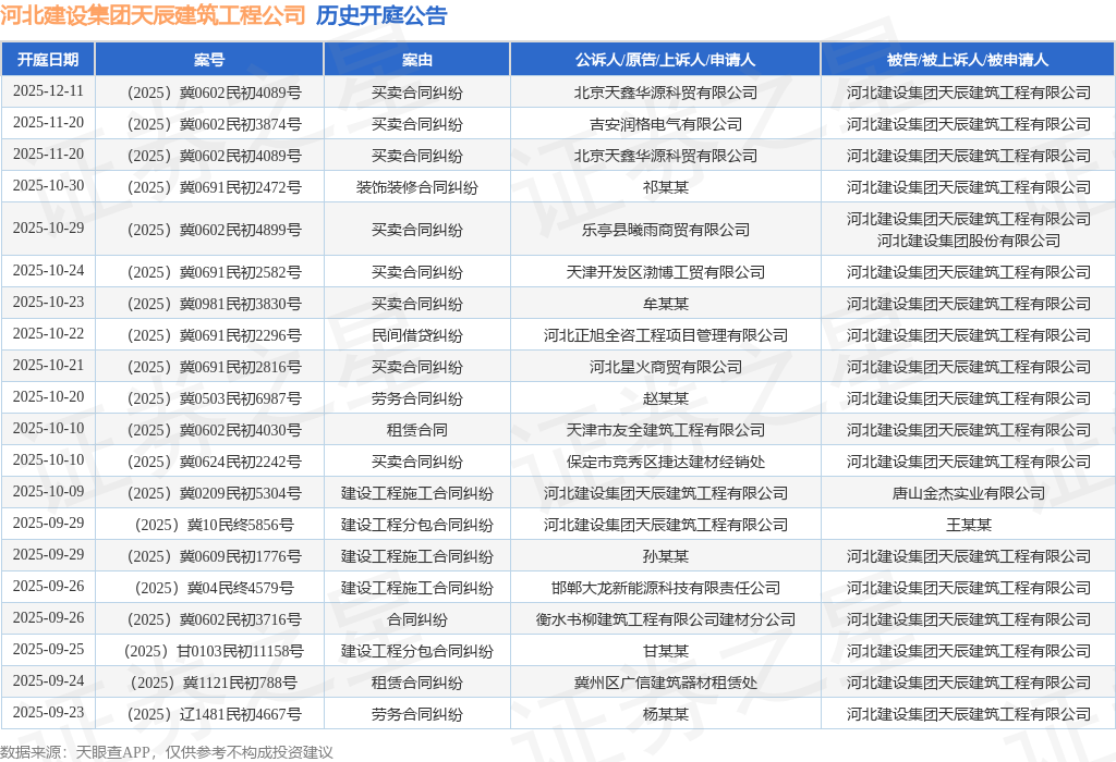 案号:(2025)冀0602民初4899号根据统计,近一年内以河北建设集团天辰建筑工程有限公司为当事人的历史开庭公告有162则,其中案由为“买卖合同纠纷”的公告以60则居首,其次为“建设工程施工合同纠纷”有28则,“合同纠纷”有13则。历史开庭公告(前20条)如下: