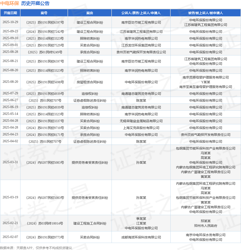 案号:(2025)苏0191民初6597号根据统计,近一年内以中电环保股份有限公司为当事人的历史开庭公告有27则,其中案由为“买卖合同纠纷”的公告以9则居首,其次为“建设工程合同纠纷”有3则,“承揽合同纠纷”有3则。历史开庭公告(前20条)如下: