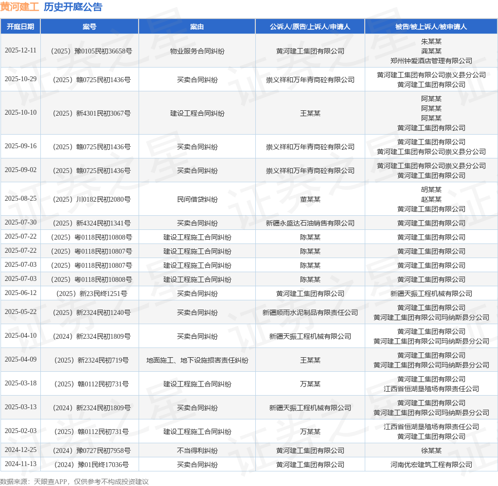 案号:(2025)赣0725民初1436号根据统计,近一年内以黄河建工集团有限公司为当事人的历史开庭公告有20则,其中案由为“买卖合同纠纷”的公告以9则居首,其次为“建设工程施工合同纠纷”有6则,“不当得利纠纷”有1则。历史开庭公告如下: