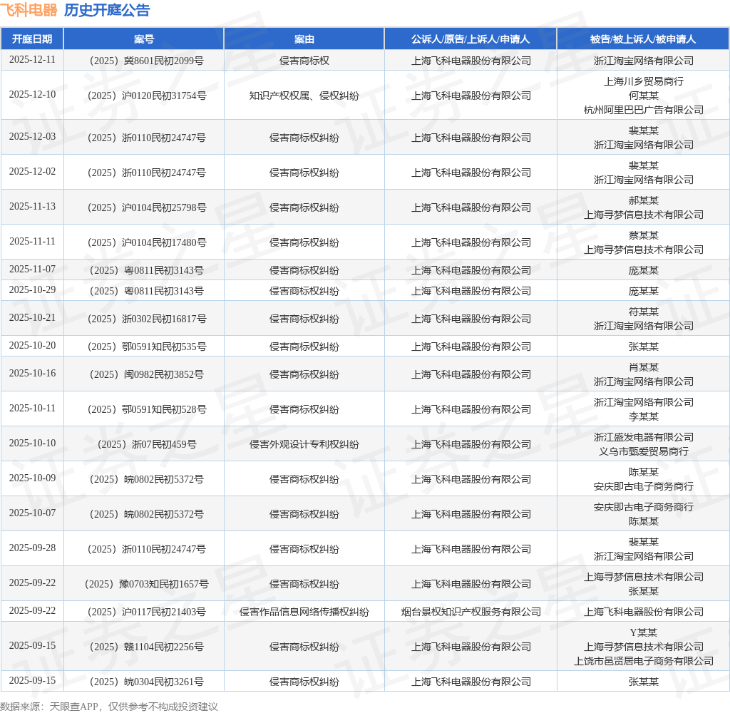 案号:(2025)粤0811民初3143号根据统计,近一年内以上海飞科电器股份有限公司为当事人的历史开庭公告有282则,其中案由为“侵害商标权纠纷”的公告以216则居首,其次为“不正当竞争纠纷”有17则,“侵害外观设计专利权纠纷”有14则。历史开庭公告(前20条)如下: