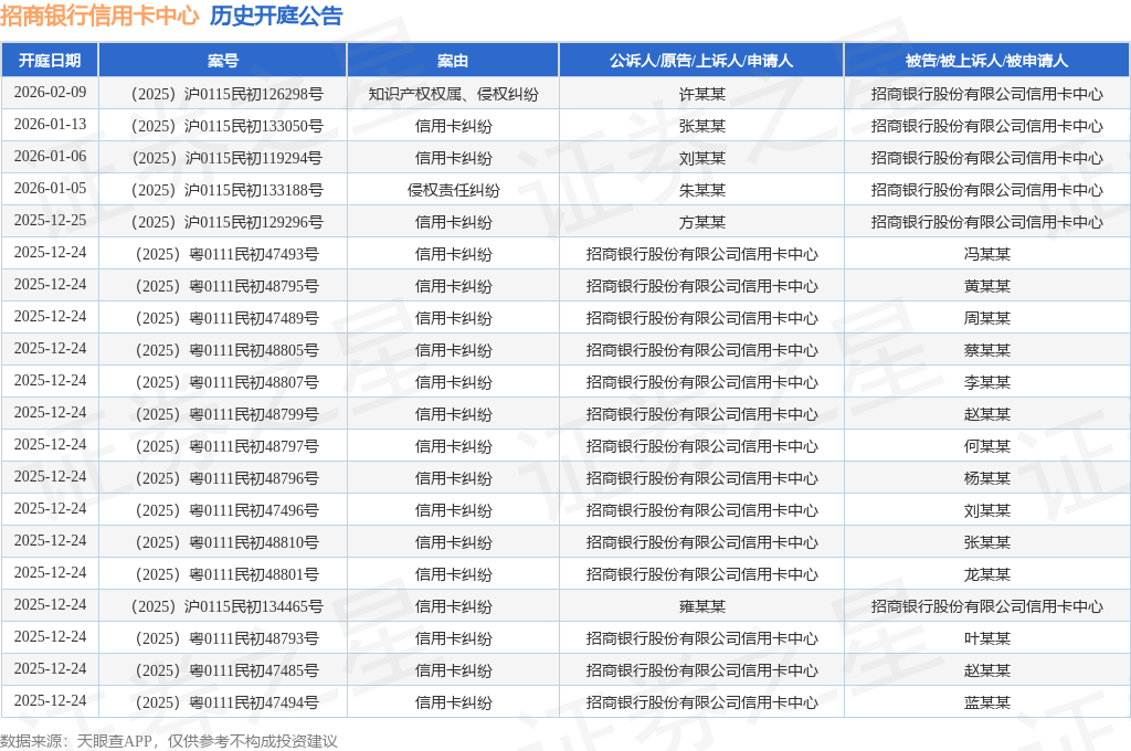 案号:(2025)云0303民初3370号根据统计,近一年内以招商银行股份有限公司信用卡中心为当事人的历史开庭公告有12385则,其中案由为“信用卡纠纷”的公告以9770则居首,其次为“金融借款合同纠纷”有2420则,“合同纠纷”有79则。历史开庭公告(前20条)如下: