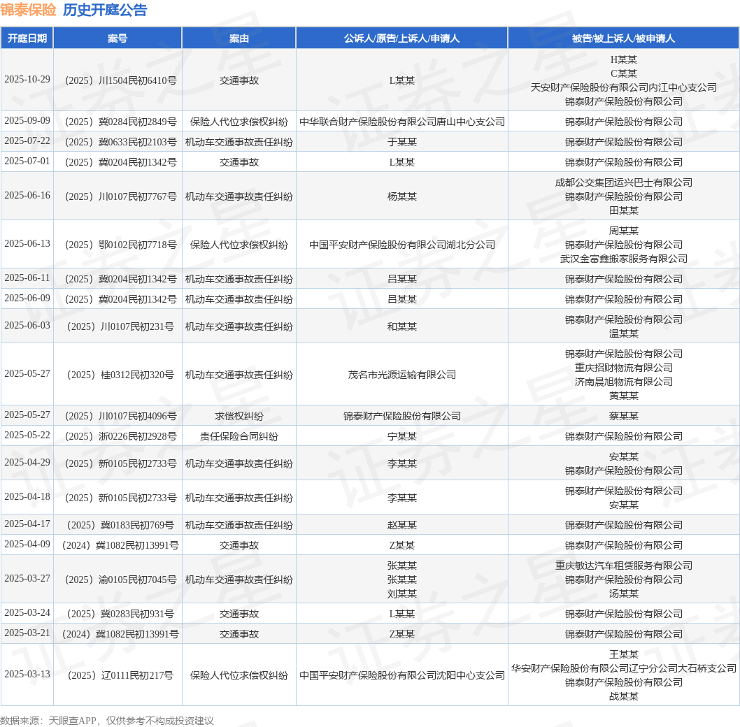 案号:(2025)川1504民初6410号根据统计,近一年内以锦泰财产保险股份有限公司为当事人的历史开庭公告有20则,其中案由为“机动车交通事故责任纠纷”的公告以10则居首,其次为“交通事故”有5则,“保险人代位求偿权纠纷”有3则。历史开庭公告如下: