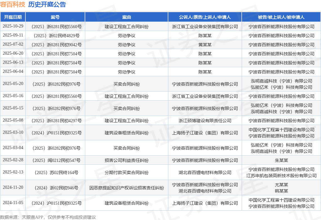 案号:(2025)浙0281民初5560号根据统计,近一年内以宁波容百新能源科技股份有限公司为当事人的历史开庭公告有16则,其中案由为“劳动争议”的公告以5则居首,其次为“买卖合同纠纷”有3则,“建设工程施工合同纠纷”有3则。历史开庭公告如下: